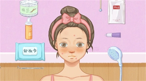 2、玩家需要给女顾客进行卸妆,首先使用卸妆水清理整个面部,再用洁面乳洗脸。
