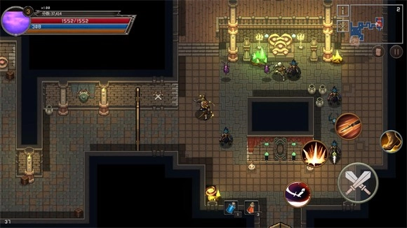 4、进入幻影塔后,右侧会新增普攻、技能与翻滚按钮,屏幕右上角则显示地图。