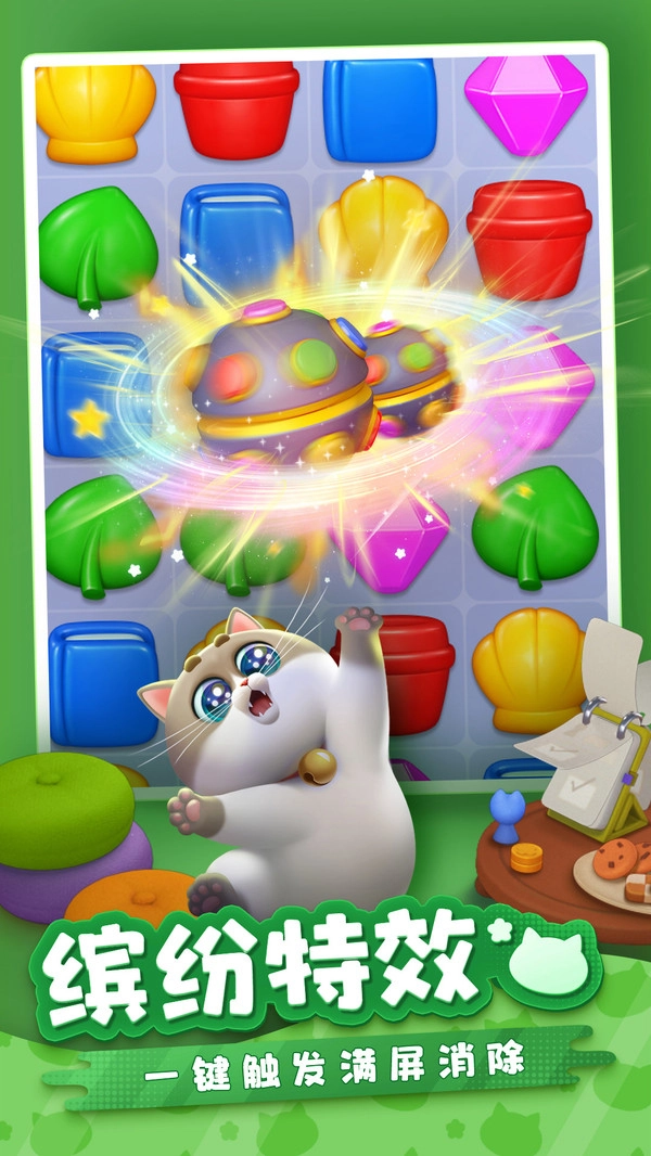 《假日乐消消》里最受欢迎的心灵理疗师是一只叫毛毛的猫咪,不管是闯关还是建造,它都会一直陪着你——有时为你欢呼鼓劲,有时傲娇地卖个萌,偶尔还会调皮捣蛋。轻轻点一下屏幕,就能和它亲密互动啦。(别担心,它不掉毛哦!)