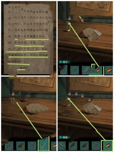玩家拿到蜜蜡后返回帐篷,走到桌旁,把筷子架在杯口,用绳子绑好,再放入蜜蜡,就能制成蜡烛。