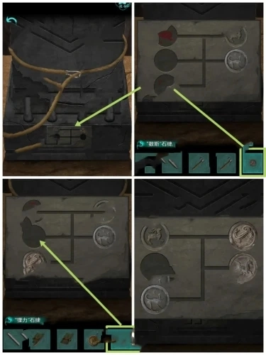 把红色图案挪到指定位置就能启动机关,接着把凿子搁在裂缝处敲断石碑,最后点击树木。