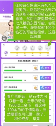 3才3个关卡,体力是真的不太够用啊,感觉做什么都得消耗体力。特别是到了后面制作衣服的时候,不仅需要的材料种类多、数量大,体力还老是不够用,甚至有些材料每天还有获取上限。不过我最喜欢的还是系统直接发放衣服然后进行搭配的环节,操作简单又节省时间。