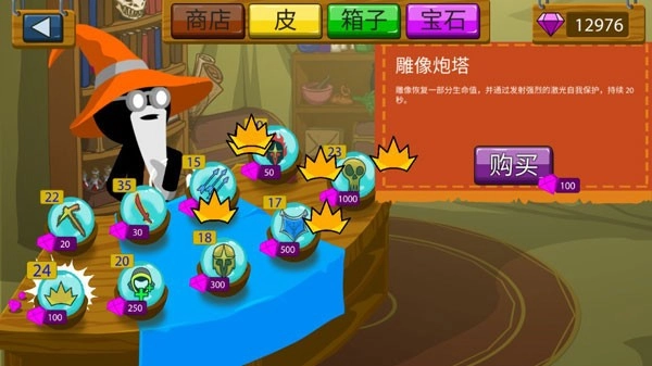 雕像炮塔:雕像恢复一部分生命值,并通过发射强烈的激光自我保护,持续20s。