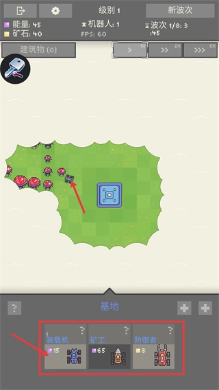 在1级阶段,优先建造【装载机】,借助它来收集资源,与此同时熟悉【矿工】【防御者】的作用,为基地后续的发展打下基础。