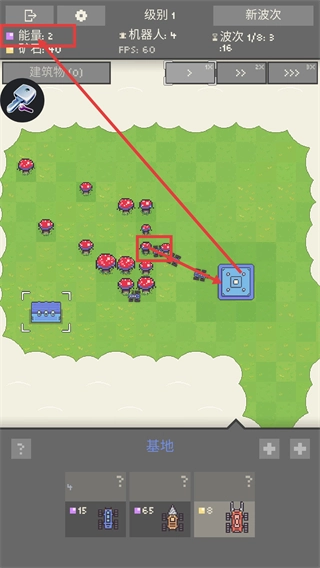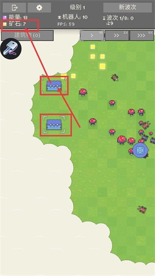收集【矿石-7】,解锁并开启宝箱来获取资源,把机器人数量提升到10个,强化基地的战斗力,以此应对波次挑战。