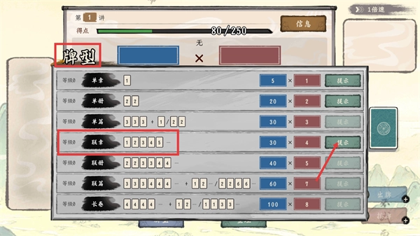在【牌型】界面选择【联章】牌型,借助【提示】功能熟悉组合规则,消耗对应资源以提高得分效率。