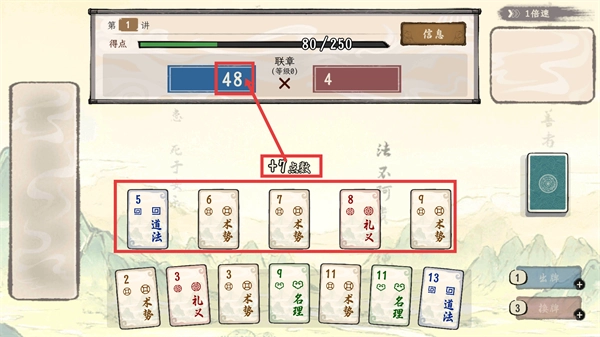 出牌时凑出连续数字的牌型,能获得【+7点数】的增益效果,还会积累【48】类数值进度,助力关卡目标的达成。