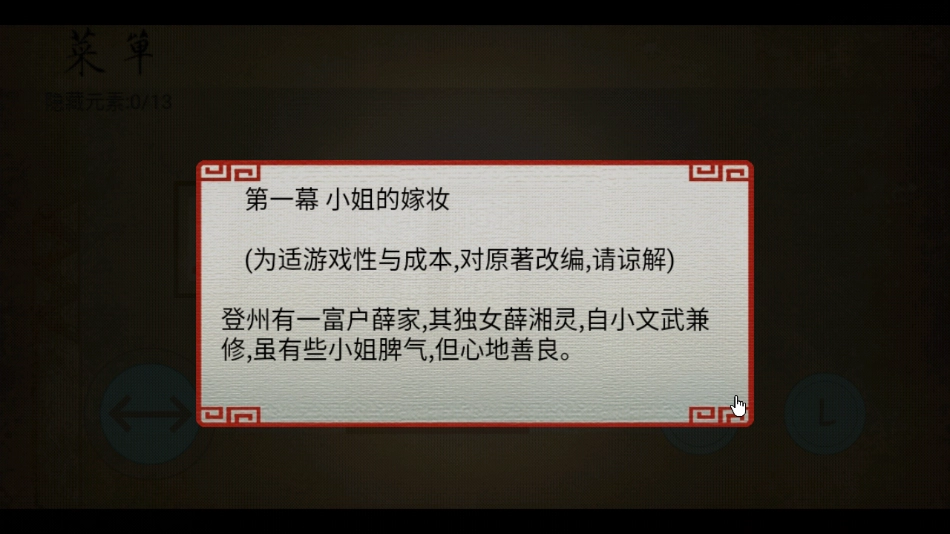 3、点击左上角的菜单,在名字下方同样有一个锁麟囊图标,点击该图标后会显示“设置”字样。(整个游戏里,只要存在游戏名的地方就会有这个锁麟囊,因此无论在哪个位置点击它,都可算作一个隐藏线索)