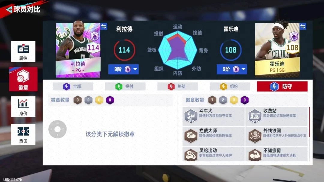 我们再看看霍乐迪的能力徽章,防守类徽章就有9个,所以要是到了中场,你的得分后卫体力不支没法上场时,完全可以派霍乐迪登场去限制对方的得分后卫。而且霍乐迪的价格确实很亲民,就算升到九阶,大概也只需要4000万左右。