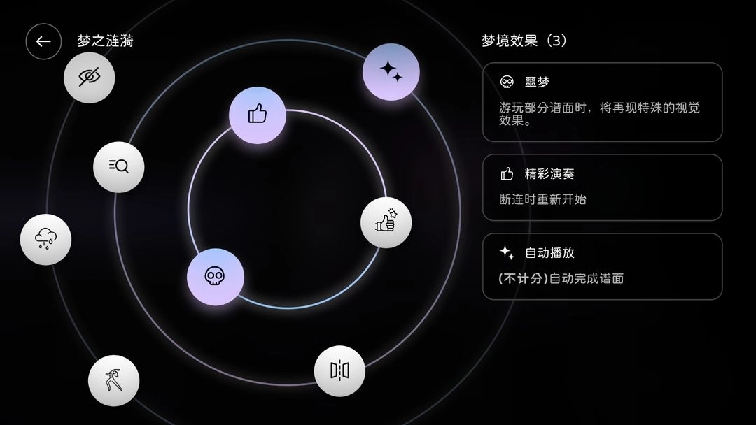 左上角的箭头可返回主界面,齿轮图标用于进入设置页面;上下箭头能够切换正序或倒序的排列模式,点击“预设”选项则可更换排列规则;月亮图标对应“梦之涟漪”功能,选择该功能后,游玩过程中会呈现特殊效果。此外,通过菜单栏还能进行章节选择。