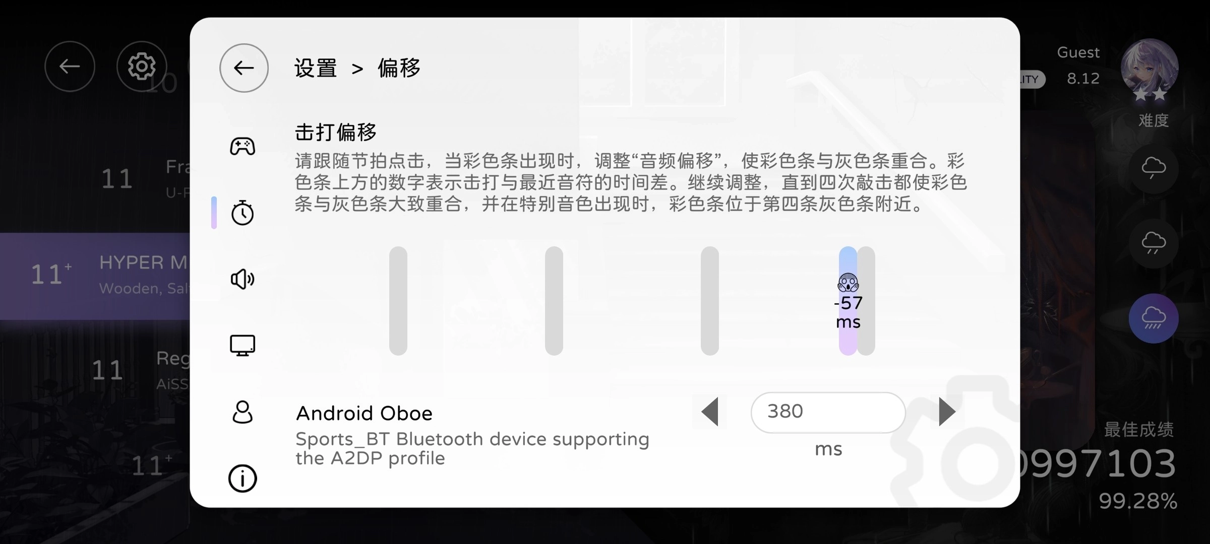玩家需跟着音乐的节拍点击空白区域,这时候要依据彩色条显示的数值来调整延迟数值。以上图为例,彩色条显示-57ms,当前偏移量是380ms,两者相加得到323ms,取320ms。再次测试时若出现爱心图标,就表明延迟对应正确,说明偏移调试成功了。