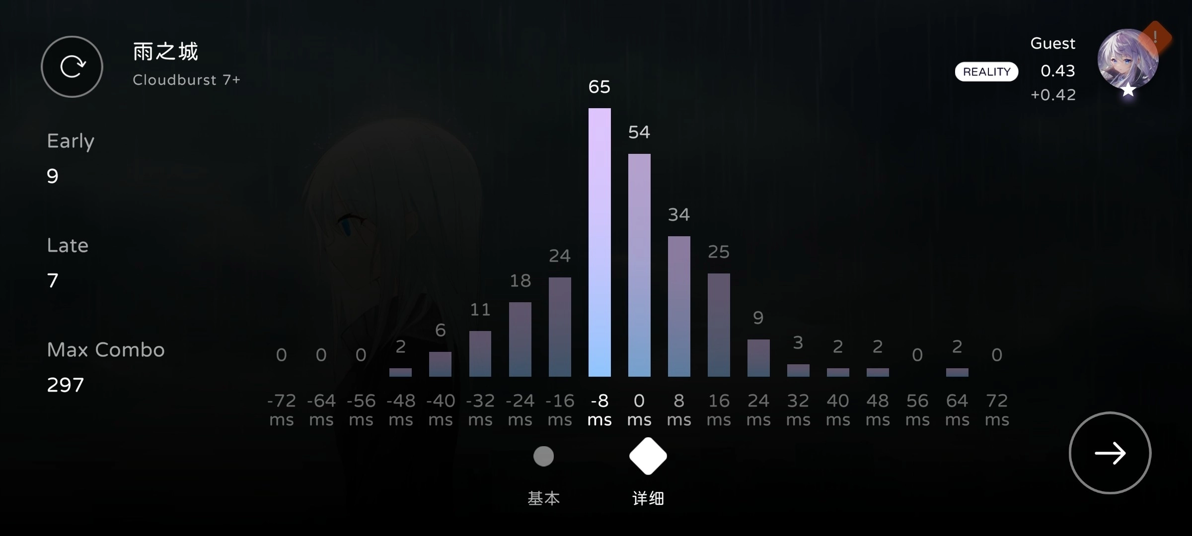 另外,因为每位玩家的设备性能、个人抓拍习惯以及流速等因素各不相同,预设的偏移值未必完全适配自己的情况,所以需要结合实际游玩时的具体表现进一步调整。建议挑选一首自己能轻松取得高分的谱面来游玩,之后点击下方的“详细”选项,就能查看判定分布图了。