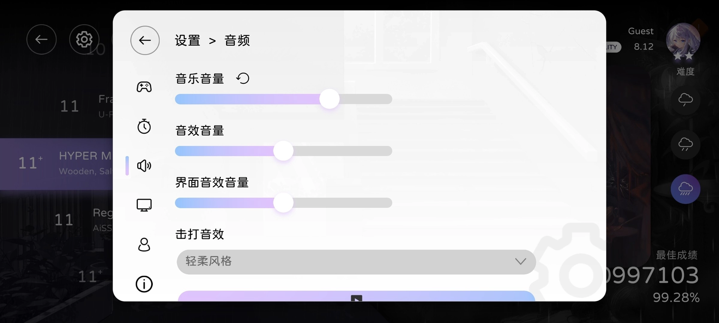 音效音量用于调节击打音效的响度,可通过击打音效下方的播放按钮试听音量效果(操作前需关闭下方的“禁用击打音效”选项)