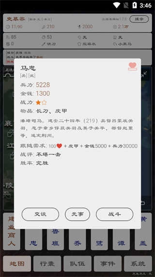 6、点击下方武将的名字,即可开展战斗或进行交流互动。