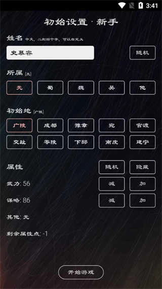 3、游戏开始前需设定所属地、初始地点与属性,点击“开始游戏”按钮即可正式进入游戏世界。