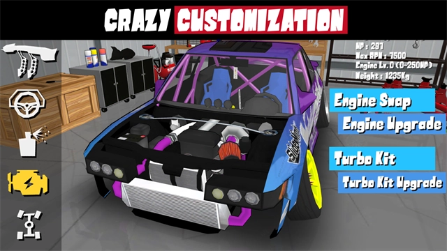 游戏中车辆分为D、C、B、A、S五个等级,每个等级有很多不同的赛车,玩家们可以花费金币解锁各个等级车辆,并且每一个车都可以通过卡牌套件来升级车辆属性,其中包括最大速度、加速度、氮气推进、操控性四种,玩家们可以根据自己的习惯或者车辆的特性来改装升级。