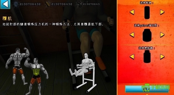 点击这个按钮即可启动当前可进行的锻炼项目,该图呈现了锻炼的具体类型。针对不同的锻炼内容,都配有详尽的数据展示,以腹肌锻炼为例,不仅有对应的图示说明,还提供了道具使用的选项,具体如图所示: