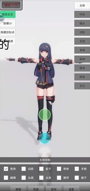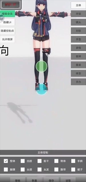 3、点击四肢部位,在角色模型上,青蓝色的球体能够操控四肢的移动。
