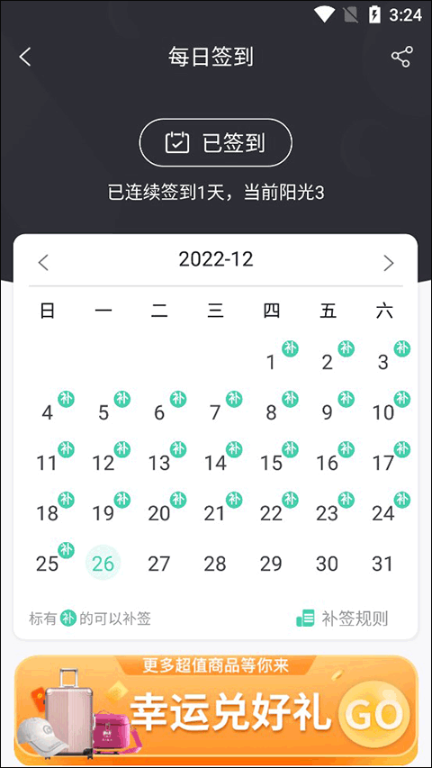这时有朋友会问,截图里日历上那些标有"补"字的日期是什么意思。这些带"补"字的日期表示用户当天没有签到,系统提供了补签机会。不过补签是有要求的:每补签一天需要消耗100个阳光值,而且补签不能获得当天的签到阳光奖励,但会像正常签到一样计入连续签到天数。