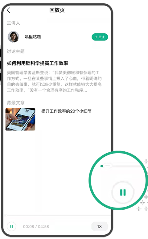 直播回放功能,可以回看任何一场精彩直播;高价值内容不容错过,知识观点反复推敲。