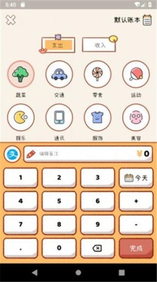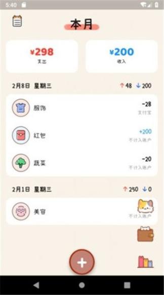 1、记账操作:打开喵记账,映入眼帘的是简洁明了的界面。用户只需轻点屏幕,就能轻松记录每一笔收支。收入和支出分类细致,涵盖生活的方方面面,如餐饮、购物、交通等。每完成一笔记账,都会有对应的猫咪形象出现,为记账增添乐趣。