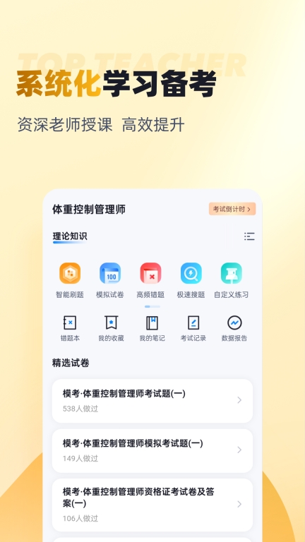 体重控制管理师考试聚题库是一款专为准备体重控制管理师资格考试的用户设计的安卓应用,提供大量真题模拟与解析,支持章节练习、错题回顾等功能,帮助考生高效备考,随时随地进行学习和自我测试。
