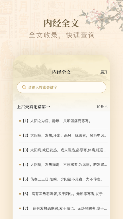 1. 经典篇章阅读:用户可以随时随地阅读《黄帝内经》的经典篇章,包括《素问》、《灵枢》等中医古籍原文全译文集部分。