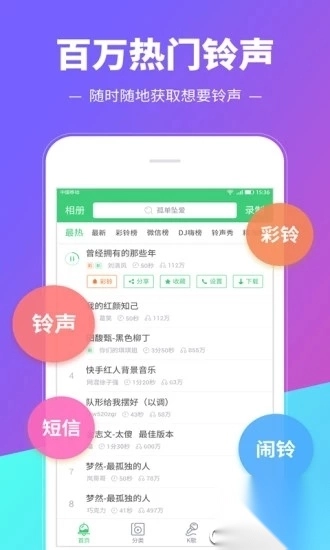 百万免费铃声,轻松一键设置!铃声,彩铃,短信,闹铃全都搞定。
