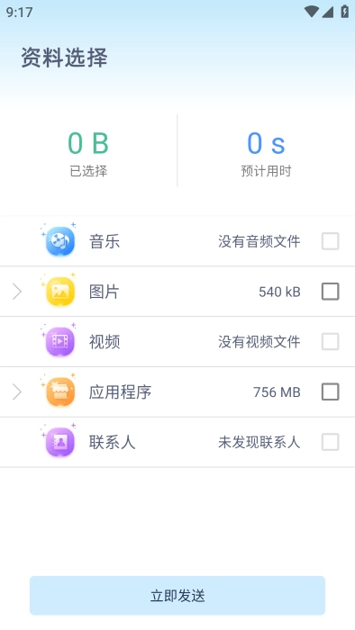 发送资料可以选择音乐、图片、视频、应用程序、联系人