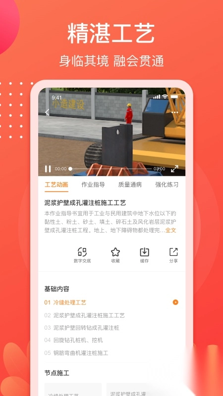 全方位的工艺教学,带你从建筑知识的入门逐步走向精通,无论何时何地都能随心学习。搭配三维动画视频,以手把手的方式,细致传授各项建筑技能。从观看演示,到实际练习,再到造价计算,助力你深度理解并真正内化关键知识,做到举一反三,灵活运用。