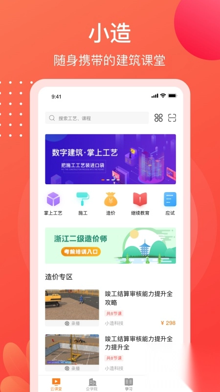 小造app,作为聚焦建筑行业的学习交流平台,有着海量课程知识,课程分类清晰明了。在这里,你能实时在线学习并互动,还有行业大师在线给予专业指导,助力你探索更深层次的行业内容。不仅如此,平台的三维动画学习视频,以更直观的教学方式,帮助用户在观摩过程中熟练掌握各项建筑技能。快来下载体验吧!