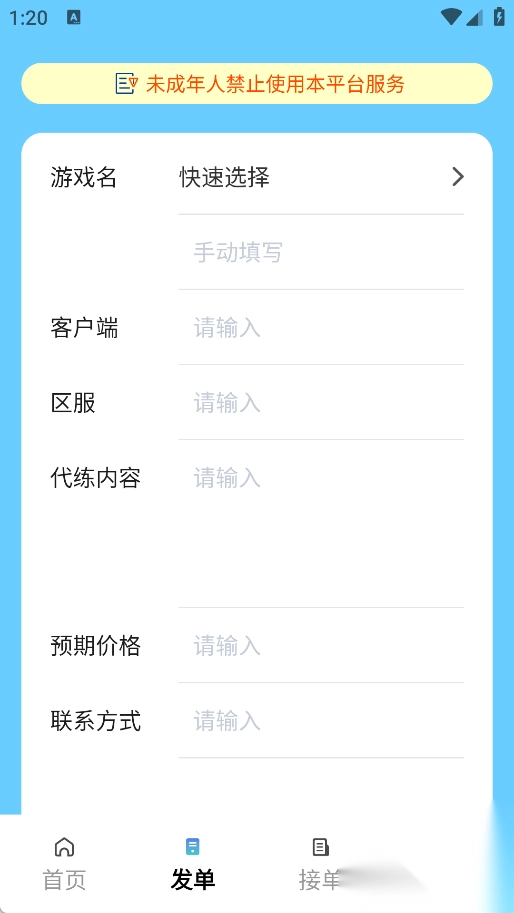 2、于发单页面内挑选游戏名称,录入客户端、区服、代练具体内容、期望价格以及联系方式等相关信息,接着点击“立即发单”。
