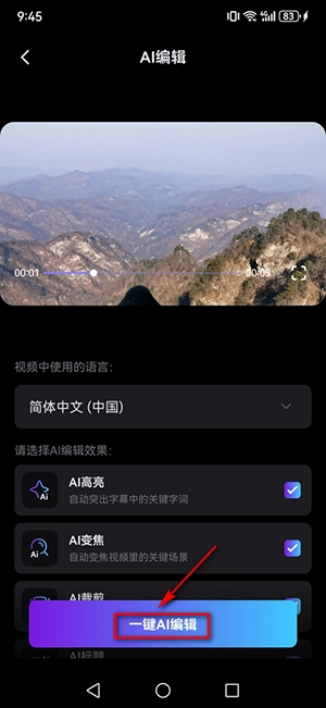 2. 挑选好视频后,能够对视频执行裁剪、变焦、添加字幕等操作,完成设置后点击【一键AI编辑】就行。