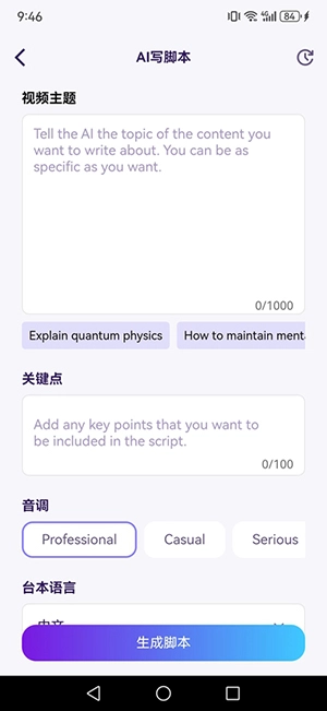 4、轻点【AI写脚本】,接着输入若干关键词与属性,随后点击【生成脚本】便可。