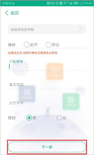 2、依次填写学校、学号、真实姓名、性别等,点击下一步;