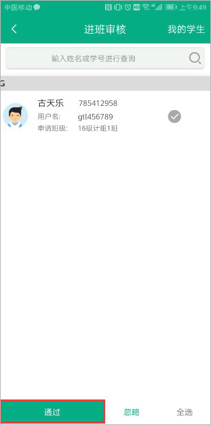 4、对于注册的学生用户,需由邀请人在APP的【注册审核】模块下执行审核操作。只有审核通过后,学生才能使用注册账号(即注册时填写的用户名),搭配注册时所填密码登录平台。邀请人点击【注册审核】,即可进入审核页面。