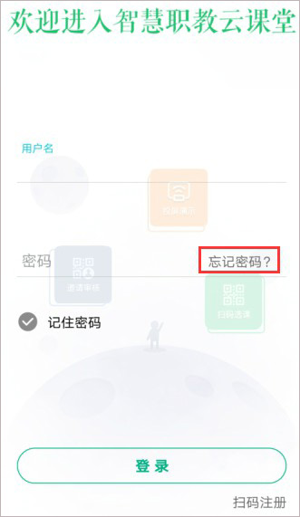 1、学生(或教师)打开云课堂APP,点击首页【忘记密码?】,如图;