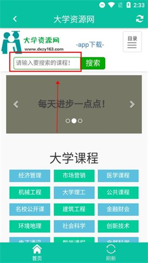 1、进入大学资源网官方app首页,有各个年级不同类型的课程,还有精品推荐课程可供选择。