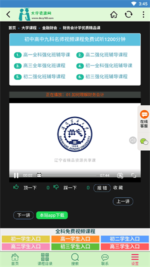 大学资源网官方版提供了丰富的在线课程,用户可以在平台上学习自己的专业课程,或者为考取其他专业的学士学位进行学习。每节课的时长都控制在20分钟左右,这样可以帮助用户在较短的时间内完成课程,更有效地吸收知识精华,并顺利完成学业。感兴趣的朋友们不妨下载体验一下。
