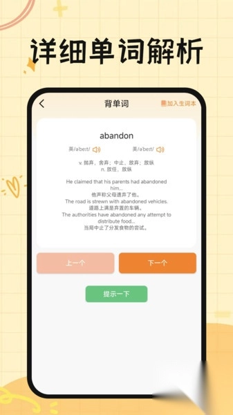 3、为每个单词配备详细音标与清晰发音音频,方便用户模仿标准发音。同时,还会呈现单词的词性、词义及例句。