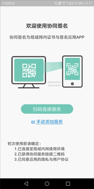 2. 在主界面,可选择点击扫码连接服务,也能手动添加服务,依据自身需求挑选连接协同服务的方式。
