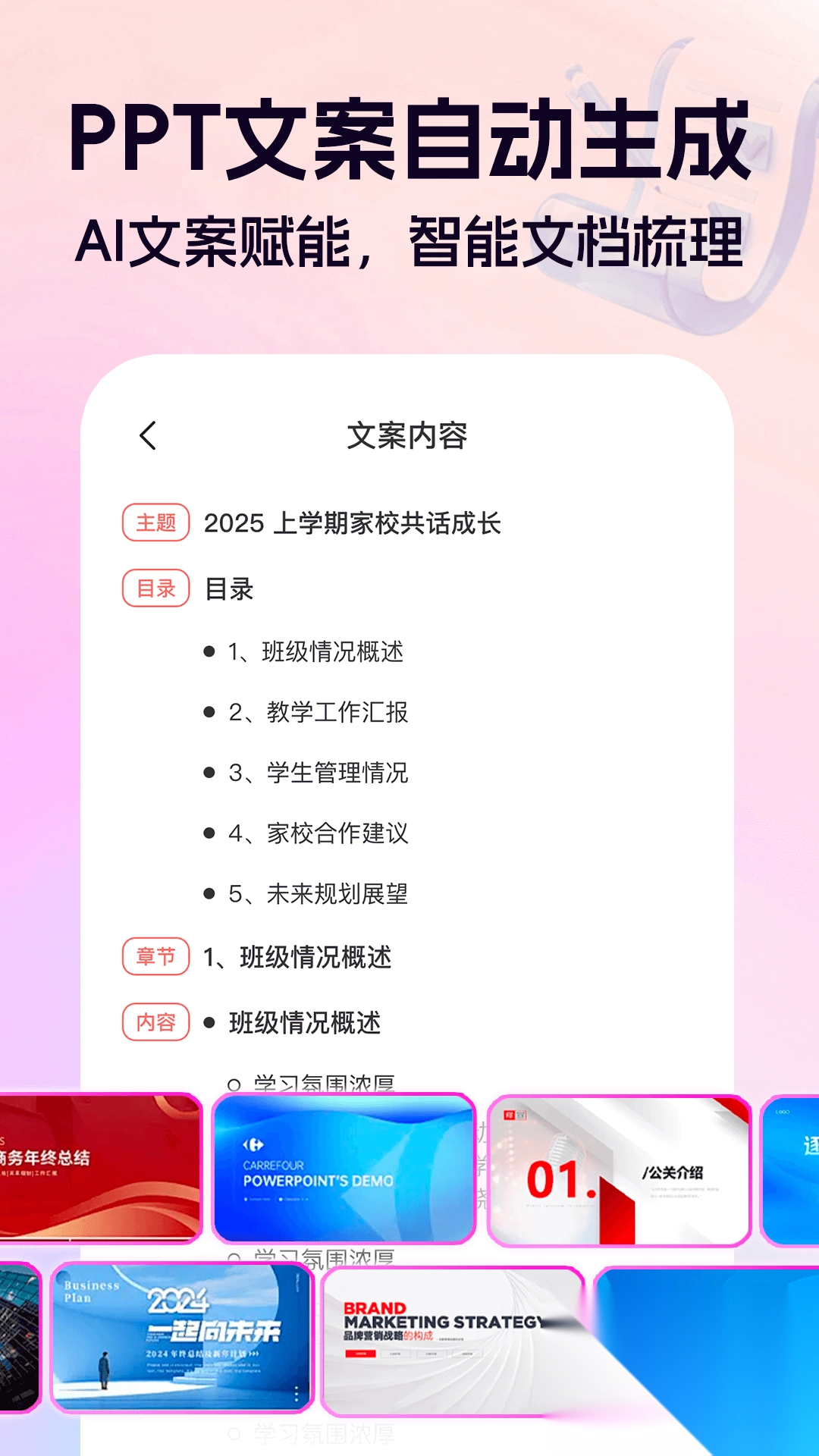 2. AI文案创作可自动生成演示内容,并提供适配行业的排版设计方案。