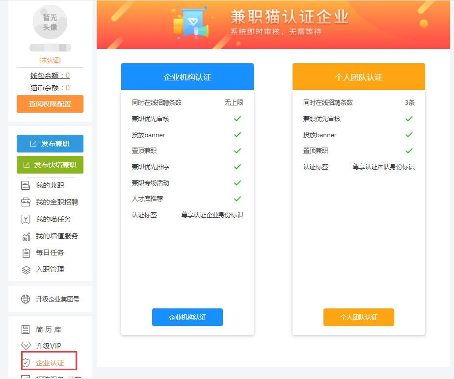 为保证平台信息的准确性,发布兼职/全职的企业都需要进行企业/个人团队认证,1分钟即可完成企业认证,在认证这步不会花费太多时间。根据自身需求选择【企业机构认证】或者【个人团队认证】