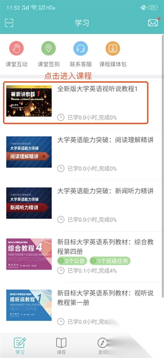 1、点击已添加的课程封面进入课程。(注意加入班级前,一定要先添加课程哦!)