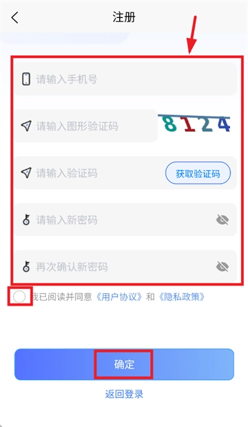 请依次输入手机号、图形验证码、短信验证码以及新密码,然后勾选“我已阅读并同意《用户协议》和《隐私政策》”,最后点击“确定”即可。