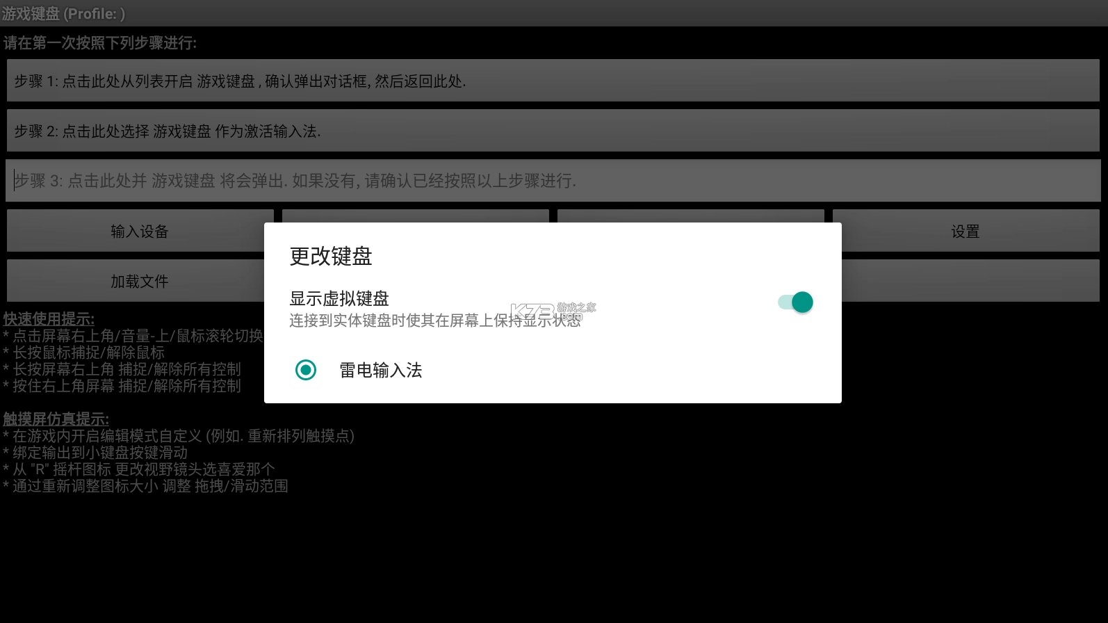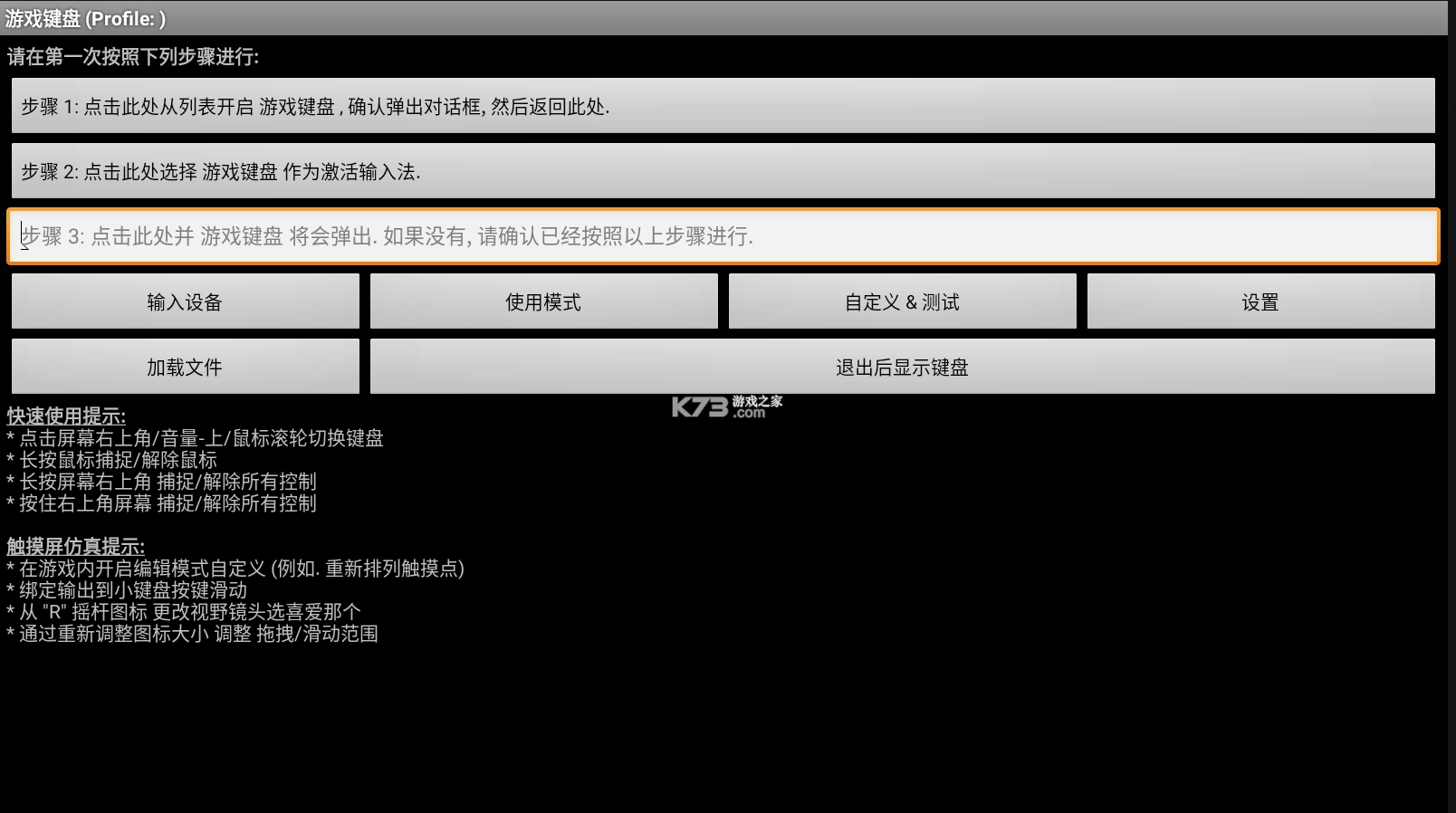1、打开gamekeyboard,显示快速使用和触摸屏仿真提示;