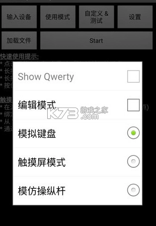 第二步:进入“usage mode”,选择游戏模式,可供选择的模式有“keyboard(键盘)、thouchscreen(触屏)、joystick(类比摇杆)” 。