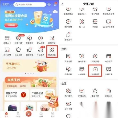 1、在华彩生活app首页点击“全部功能”—“金融”—“在线取现”