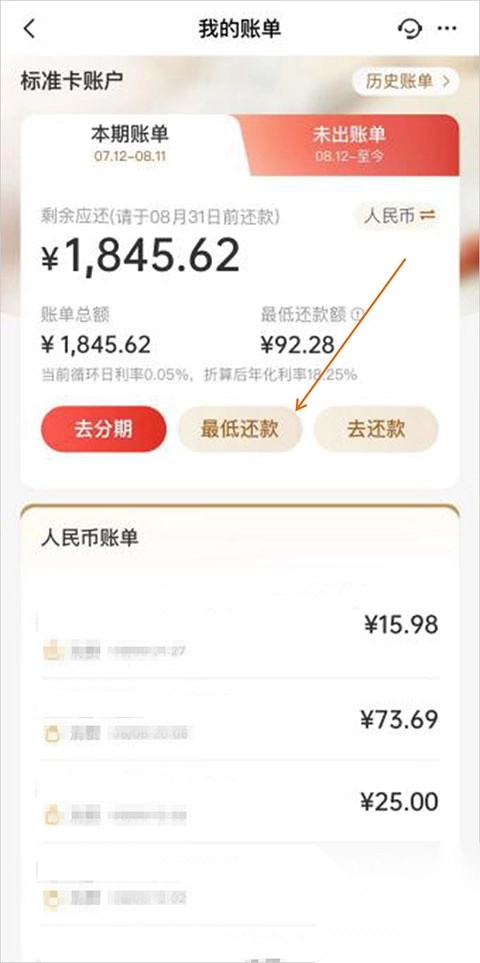 2、接着点击“最低还款”(全额还款只需要在此页面点击“去还款”即可全额还款)