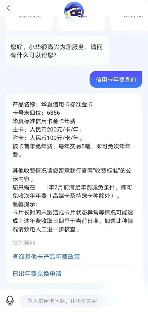 1、登录“华彩生活”,点击“首页”,右上角点击客服,输入“信用卡年费查询”。